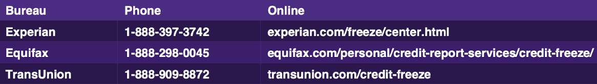 Great question! Freezing your credit is an essential step to protect yourself from identity theft, and it’s super easy to do! You’ll need to contact all three major credit bureaus, Equifax, Experian, and TransUnion, individually to request a freeze (see table below). Freezing your credit prevents anyone from creating new accounts in your name, and you can temporarily lift the freeze if you need to apply for credit.
