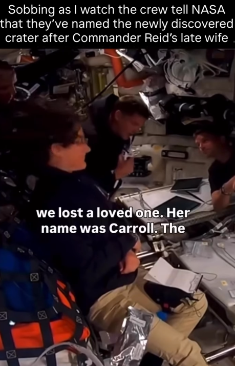 I was sobbing as I watched the crew tell NASA that they’ve named the newly discovered crater after Commander Reid’s late wife.